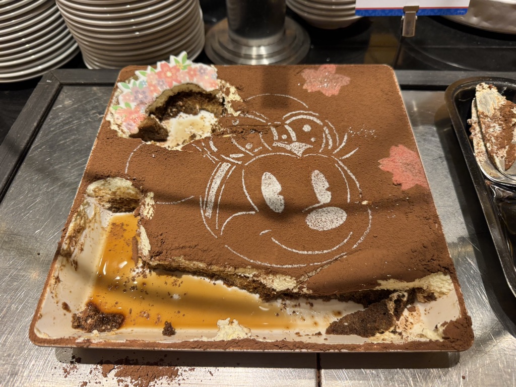 グリ前のティラミスの様子。日本人の配慮の心というか、ミニーちゃんの顔を壊すまいという決意が感じられますが、このままではフードロスまっしぐら。遠慮するな日本人。