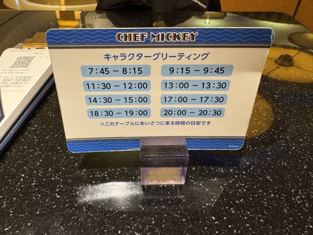 こちらが本題。というか皆さんこのために必死こいて予約を取るわけです。先程の最高の料理を作ってくれたのは誰を隠そう世界の人気者 ミッキーマウスその人(という設定)なのです!シェフ・ミッキーは我々ゲストにふらっと挨拶に来てくれ・・・るわけではなくゴリゴリ時間は決まっています。どの予約枠であってもかならずグリ時間が被るような時間設計がされているので、せっかく来店したのにグリできないということは起こりません。