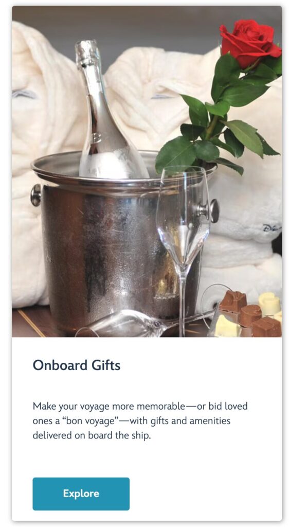 ディズニー・クルーズはオールインクルーシブを謳っていますが、実のところは課金Itemも盛り沢山です。例えば通常のレストランとは別に、有料レストランがあったり、有料バーがあったり。しかし私のようにDオタに片足を突っ込んだ人間にってはそれ以上に課金欲をそそられてしまうものがあります。「Onboard Gifts」という課金サービスです。