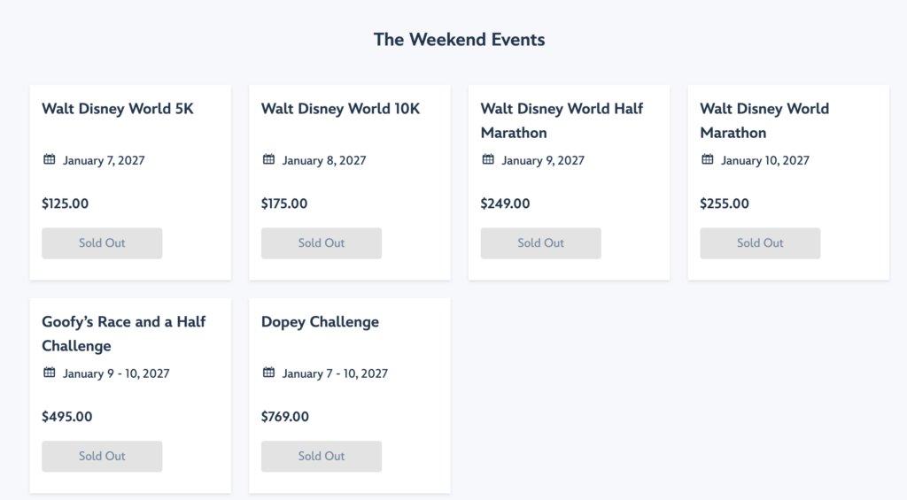 チケット価格はイベント及び距離に応じ変動し、走行距離が増えれば増えるほど値段がアップする仕組みです。Goofy’s Race and a Half Challengeというのは、フルマラソンとハーフマラソンを両方走るチケット、及びDopey Challengeというのは全4種を走るチケットです。